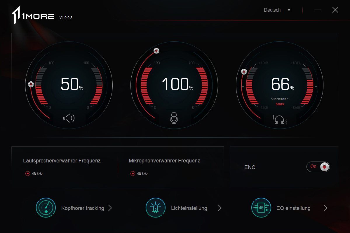 In the box there’s the headset itself, along with a two-metre-long USB type A cable, a 3.5 mm audio cable at a total length of approximately 1.3 metres, as well as a storage bag. In addition to this, there’s a manual and a manufacturer sticker. The USB cable turns out to to be the most useful accessory of the bunch, allowing you to enjoy more functionality from your headset than you might first think possible. The corresponding software must first be downloaded and installed from 1more, but once this is done and the headphones have been connected, you can start tailoring the settings in accordance with personal preferences.