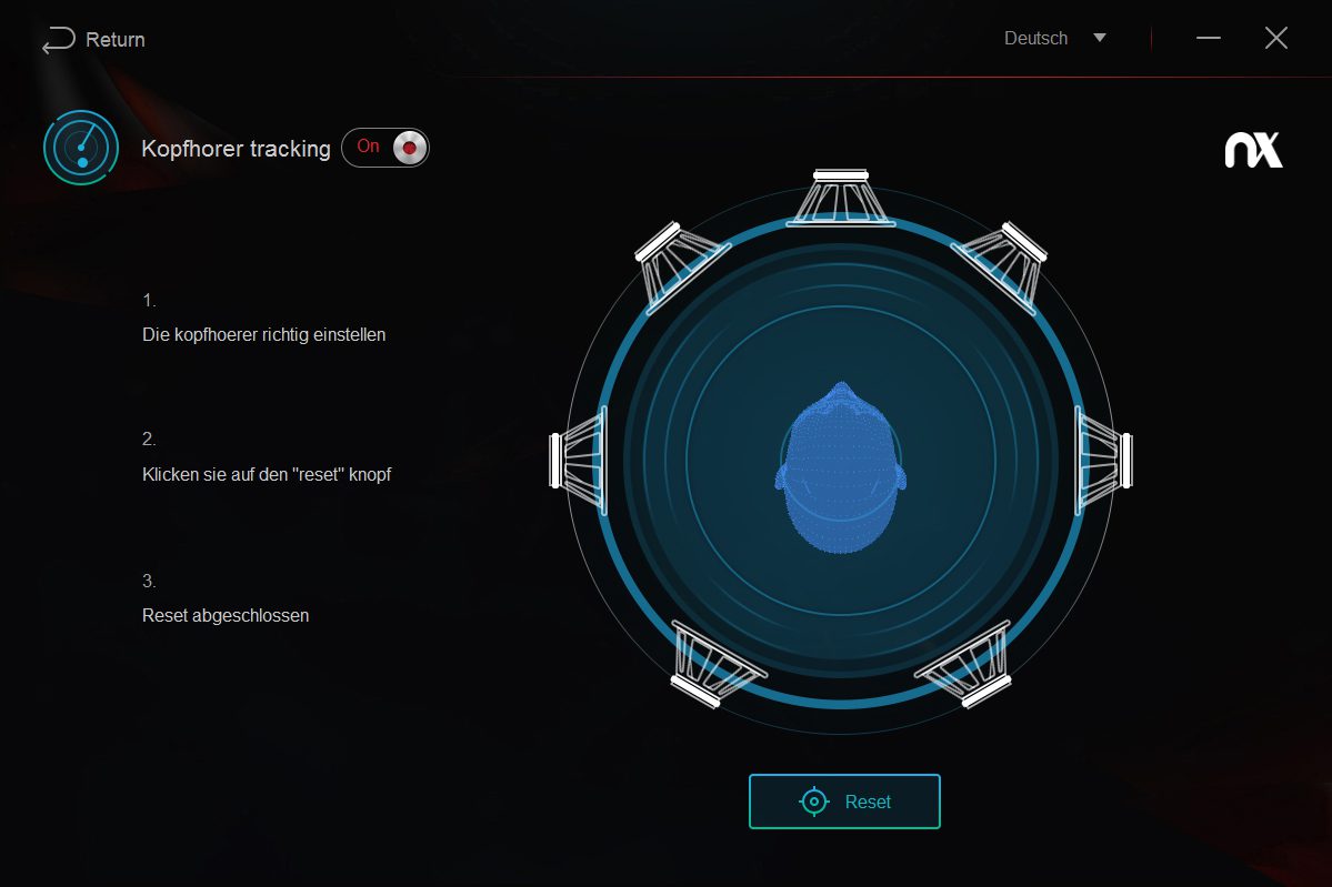 What makes the Spearhead VRX a particularly special headset is the head-tracking device technology of the device. NX technology, from Waves, comes into play here. This detects the position of the headphones and always ensures they’re positioned correctly within the virtual space in regard to sound media. Once you’ve looked in the correct position and clicked the reset button, calibration is complete and you can now refer to the handy graphics to see how to look into the direction of further speakers by moving the head.