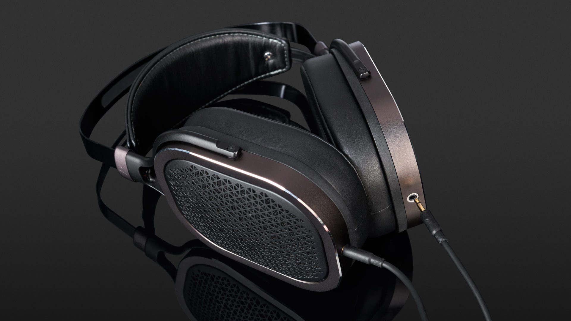 The headband produces a pleasant lateral pressure, which is evenly distributed around the ear by the memory foam padded and imitation leather-covered ear shells. I can move my head freely and the ear cushions stay in place. Incidentally, the large ear cups are a real eye-catcher. The aluminium housing is held in matte bronze and provided with a glossy finishing line on the outer edge. The strongly rounded rectangular shape is also reproduced by the upholstery. The complementary highlight is the open back of the converter. It is also made of metal and has a structure of equilateral triangles and diamonds, which, as if randomly arranged, give a fascinating pattern that I like to look at again and again. The transitions between the headband and earcup suspension are also bronze and carry the embossed company logo. The ear cups can be easily turned sideways, making them fit well to the head. The height of the padding might be a bit thick for my ears, as my ears touch the driver covers. There are 2.5 mm mono plugs on both sides of the pluggable cable. The plugs cannot be locked and also appear somewhat fragile. The cable length is just right for mobile use, but if I’m listening when stationary, then it might need to be at least half a metre longer. And if I’m already wishing for things, a less stubborn cable would be great too!