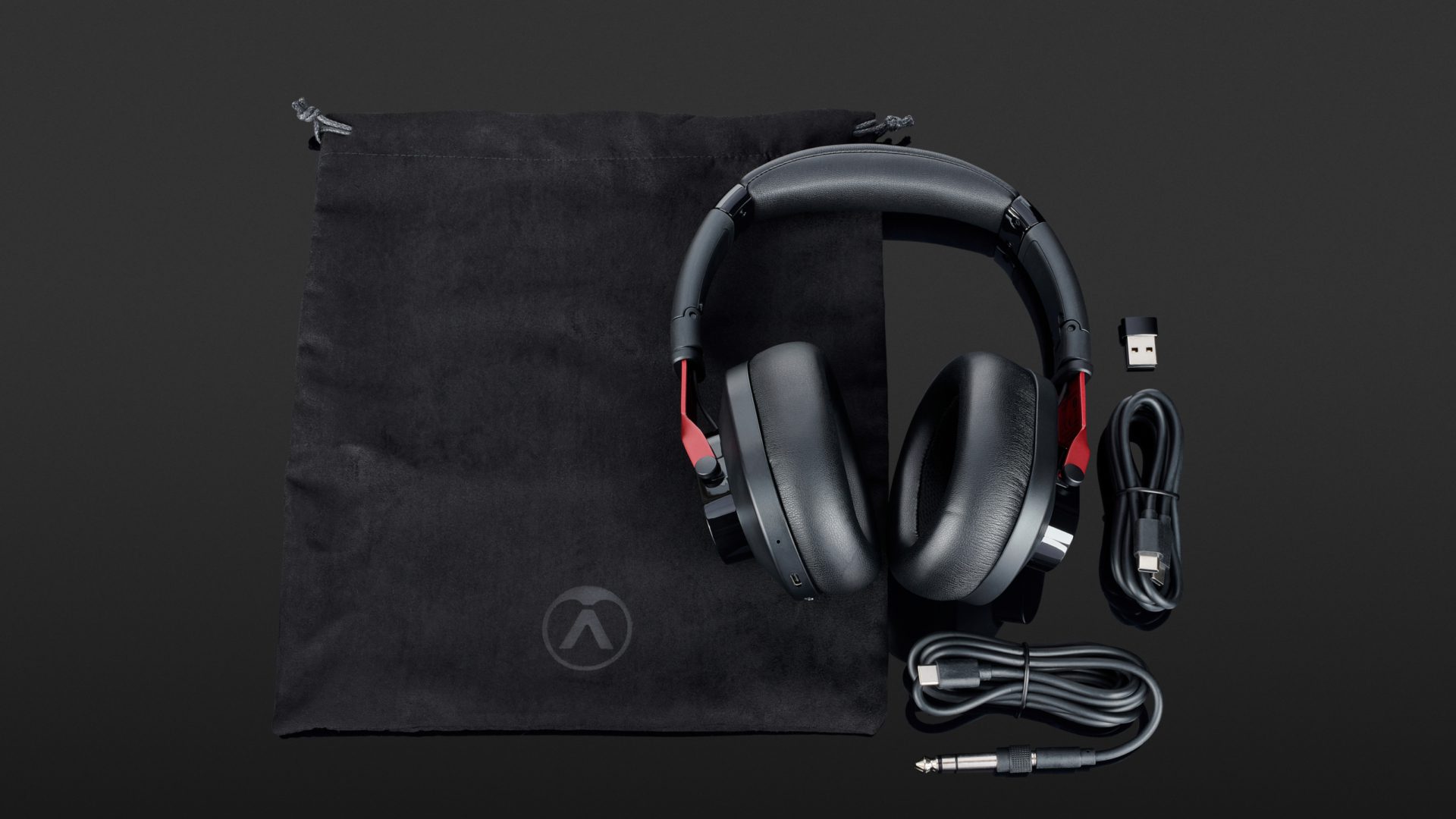 When you buy the Austrian Audio Hi-X25BT, they arrive in the familiar Austrian Audio box with a folding mechanism and red Velcro strap. The headphones are inside, dust-protected in plastic wrap. Two plastic shells surround the foam of the ear pads to prevent them from being damaged during transport. Foils are attached to the outside of the ear cups to protect them from scratches. A drawstring carrying pouch and a quick start guide are also included. You will also find a registration card for warranty extension and a sticker with the manufacturer’s logo. Of course, connection cables are also included: In addition to a USB-C cable with an adapter from USB-C to USB-A for charging the integrated battery, the second cable offers USB-C to mini jack, plus a pluggable adapter to a large jack. None of the connections is gold-plated and thus not protected against corrosion.