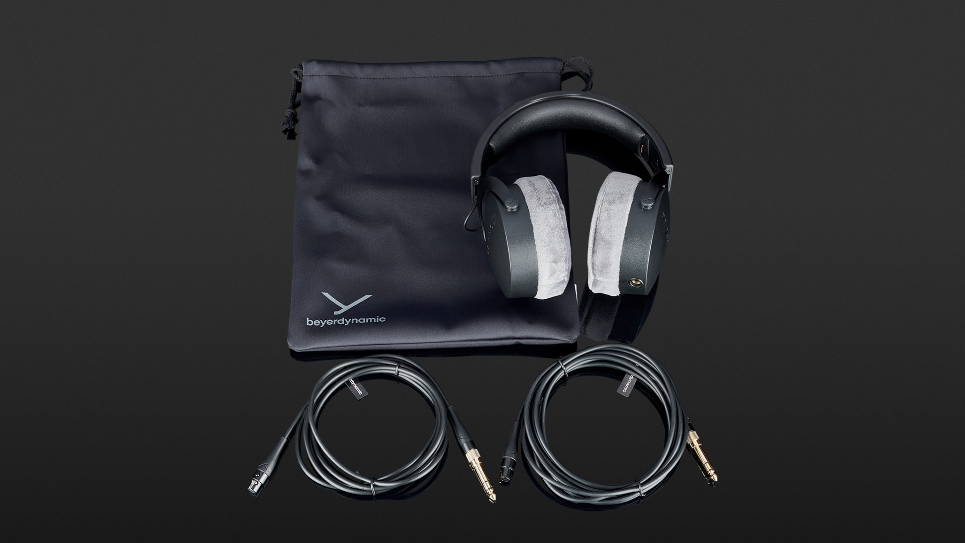 In the box with the Beyerdynamic DT 700 Pro X are some advertising leaflets and a folded manual. However, it does not contain any information on technical values. Two straight interchangeable cables with gold-plated jack plugs and mini-XLR ends are also included. Two gold-plated screw adapters with large jack plugs complete the package. There is room for these accessories in the enclosed storage pouch, which closes with a drawstring. Overall, the package makes a good impression. The two cables are straight and interchangeable rather than a fixed spiral cable, as is the case with the 250-ohm version of the DT 770 Pro.