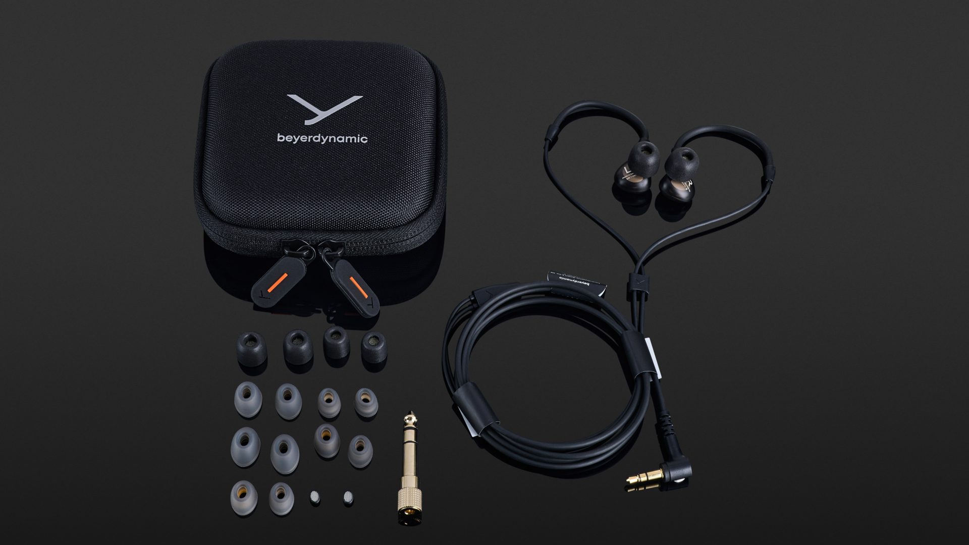 The Beyerdynamic DT 71 IE come with five pairs of silicone eartips in various sizes. Three pairs of memory foam tips in different sizes are also included. A spare set of cerumen filters is part of the package. The detachable cable ends in a 3.5 mm jack plug, which can be converted to 6.35 mm via the included adapter. All of this comes neatly packed with the in-ears in a matching soft case – an impressive package.