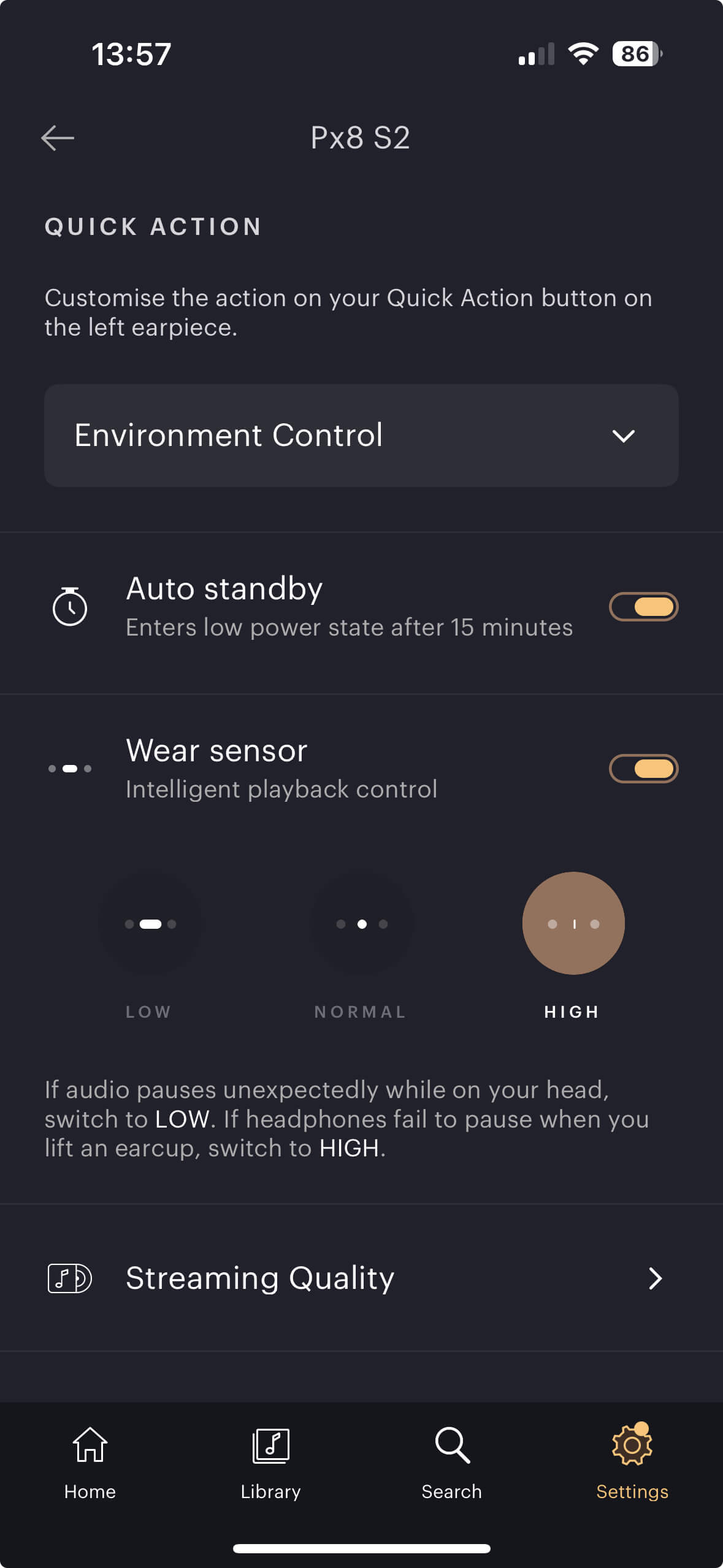 The PX8 S2 can be used largely without the app (iOS/Android), though some settings are only available there. For example, the left-side button can be reassigned to trigger a voice assistant instead of ANC toggling. The wear sensor sensitivity can also be adjusted (“low”, “normal”, “high”), influencing playback pause when the headphones are removed.