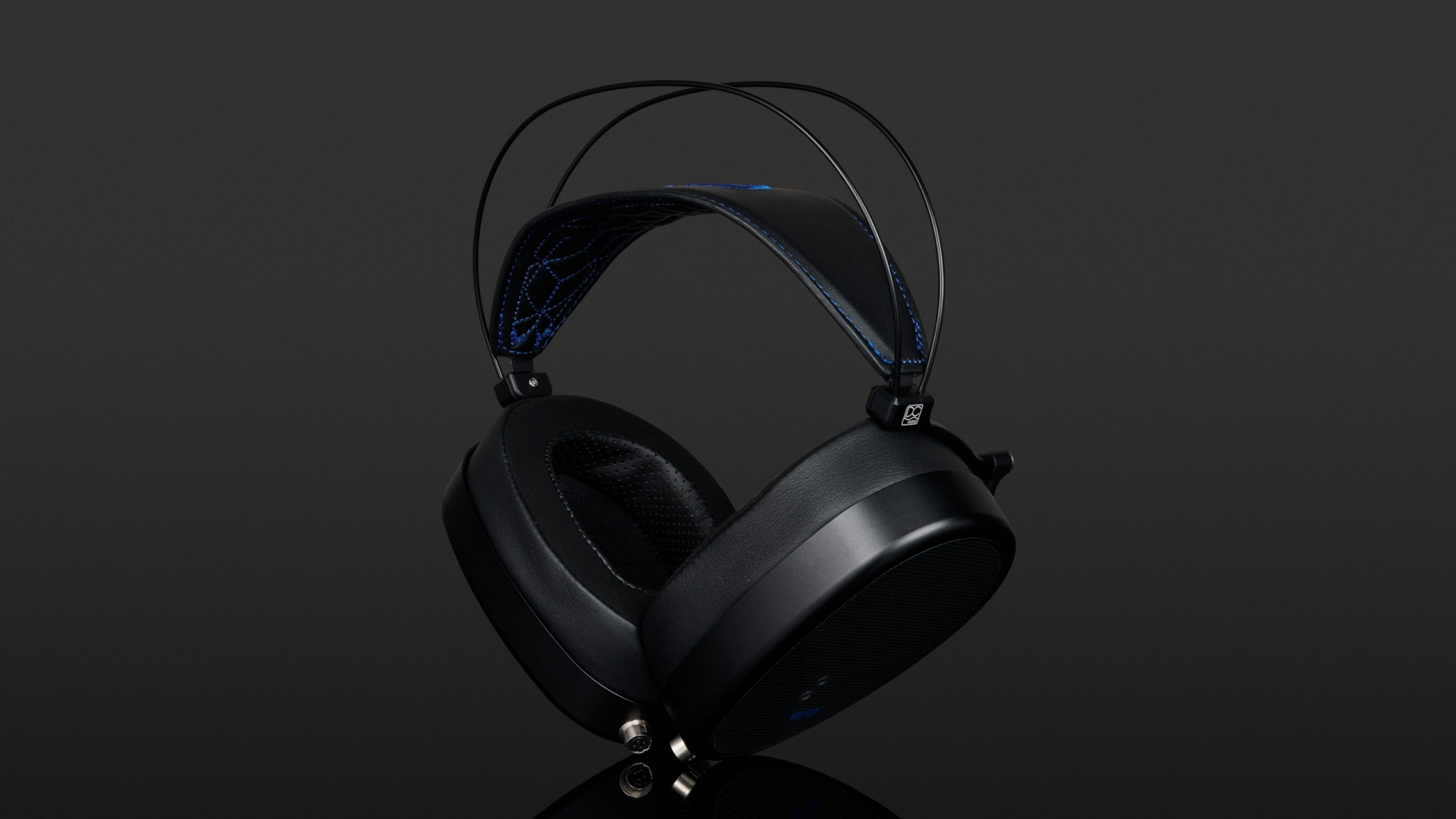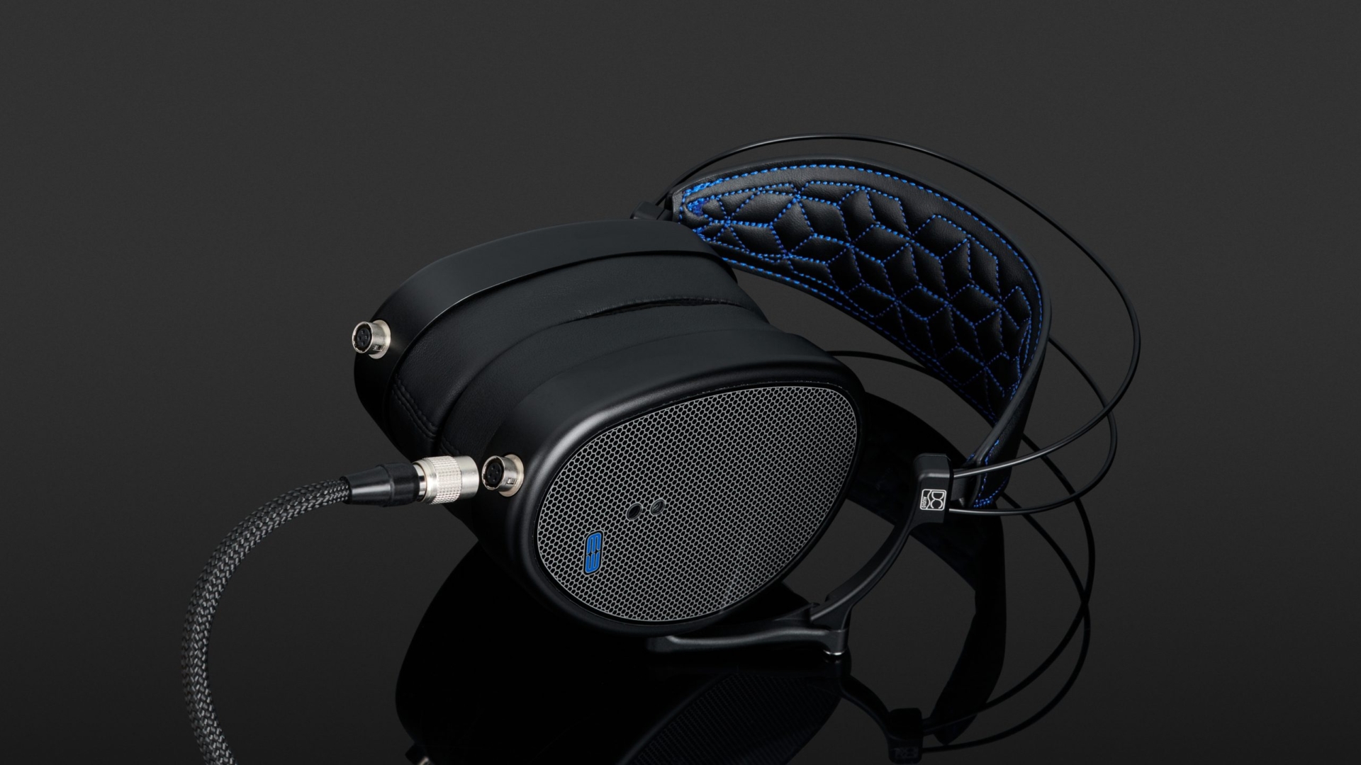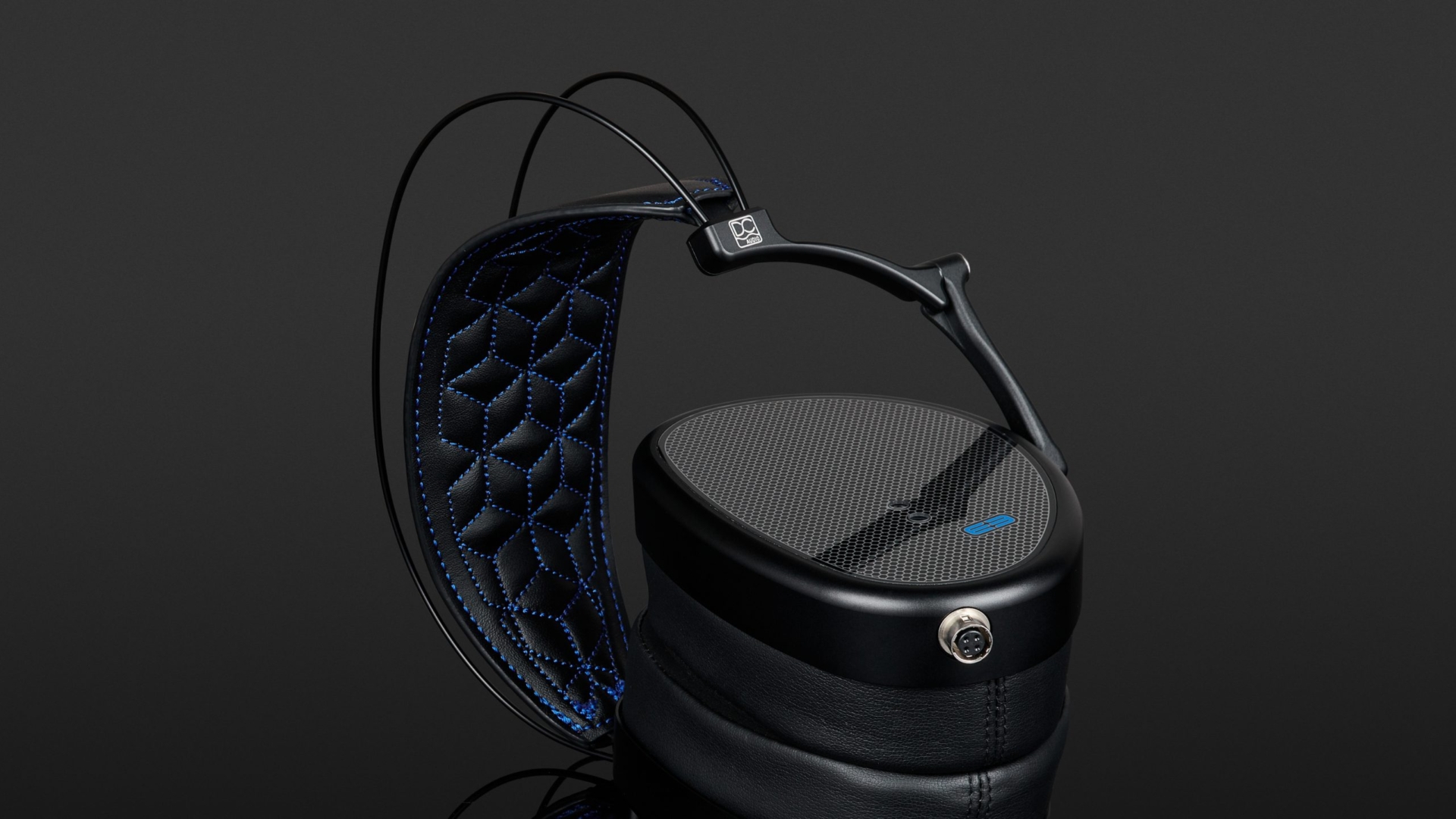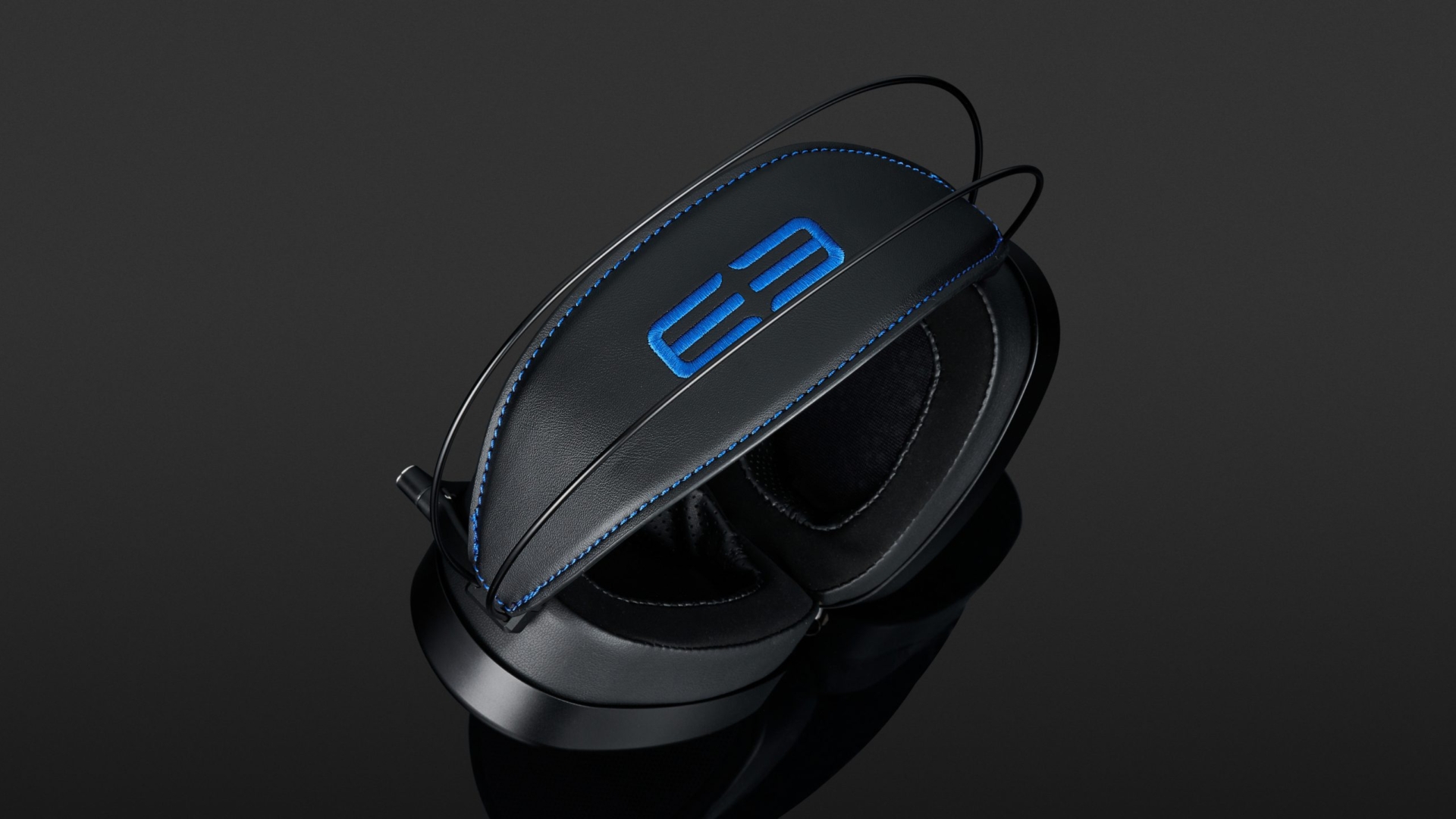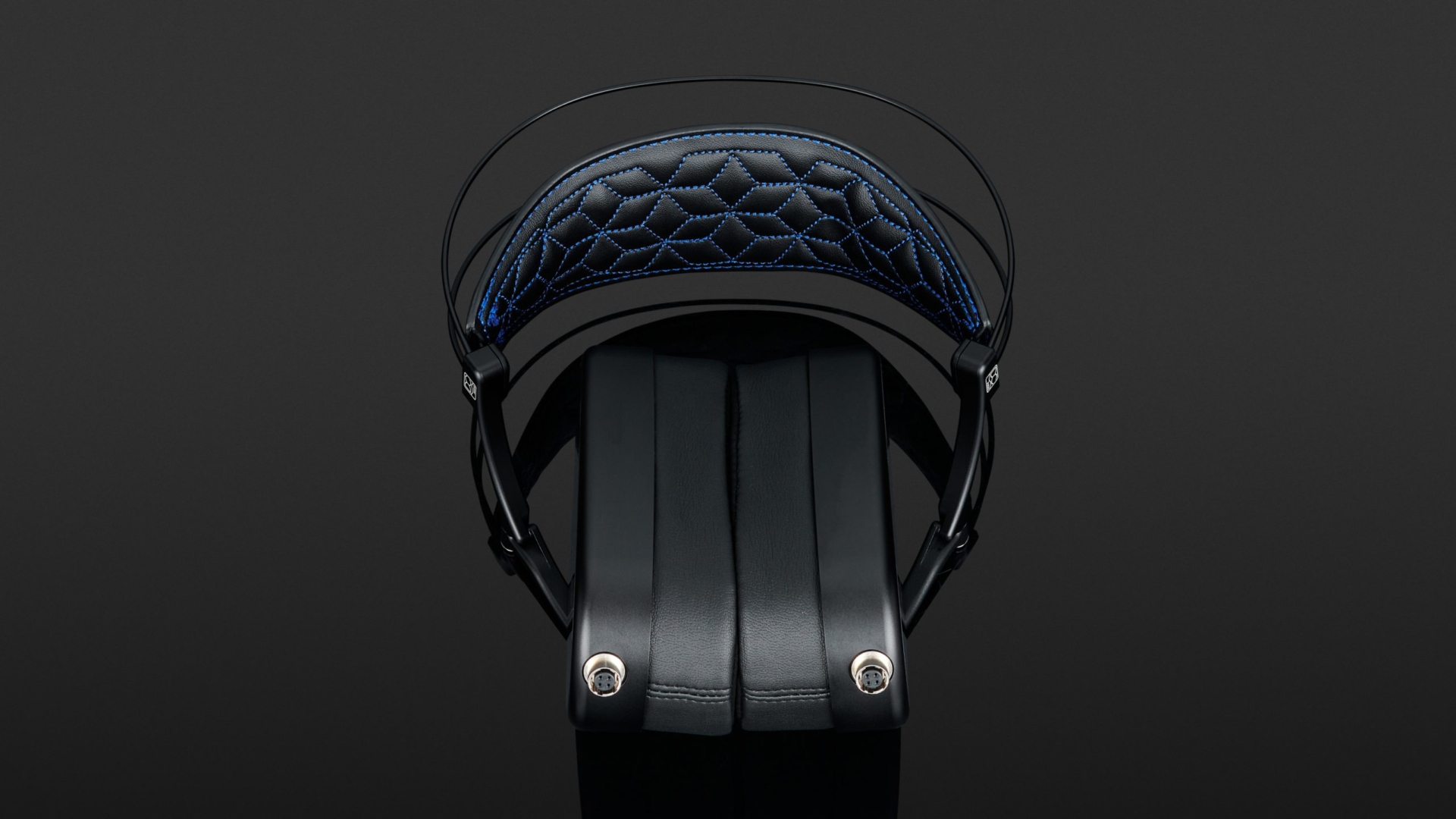 In terms of colour, the headphones are surprising, with a black base and a few blue elements. For example, the seams of the elaborately stitched headband casing and the logo embroidered on it are in blue. The combination of materials, including titanium and aluminium, makes these headphones both robust and lightweight. Another material used in the E3 is Gorilla Glass, which is as scratch and break-resistant as it is decorative. It forms the back of the earcups. The suggestion of mesh under the glass gives an indication that these closed headphones are aiming to compete with open models. There are small holes in the glass to allow excess bass energy to escape. This is intended to prevent the bass from building up, among other things.