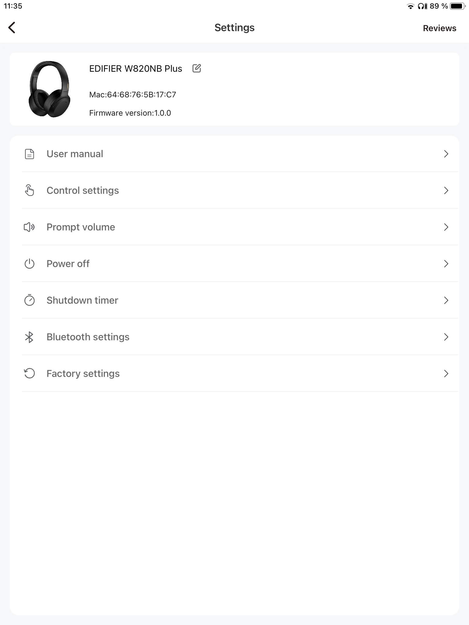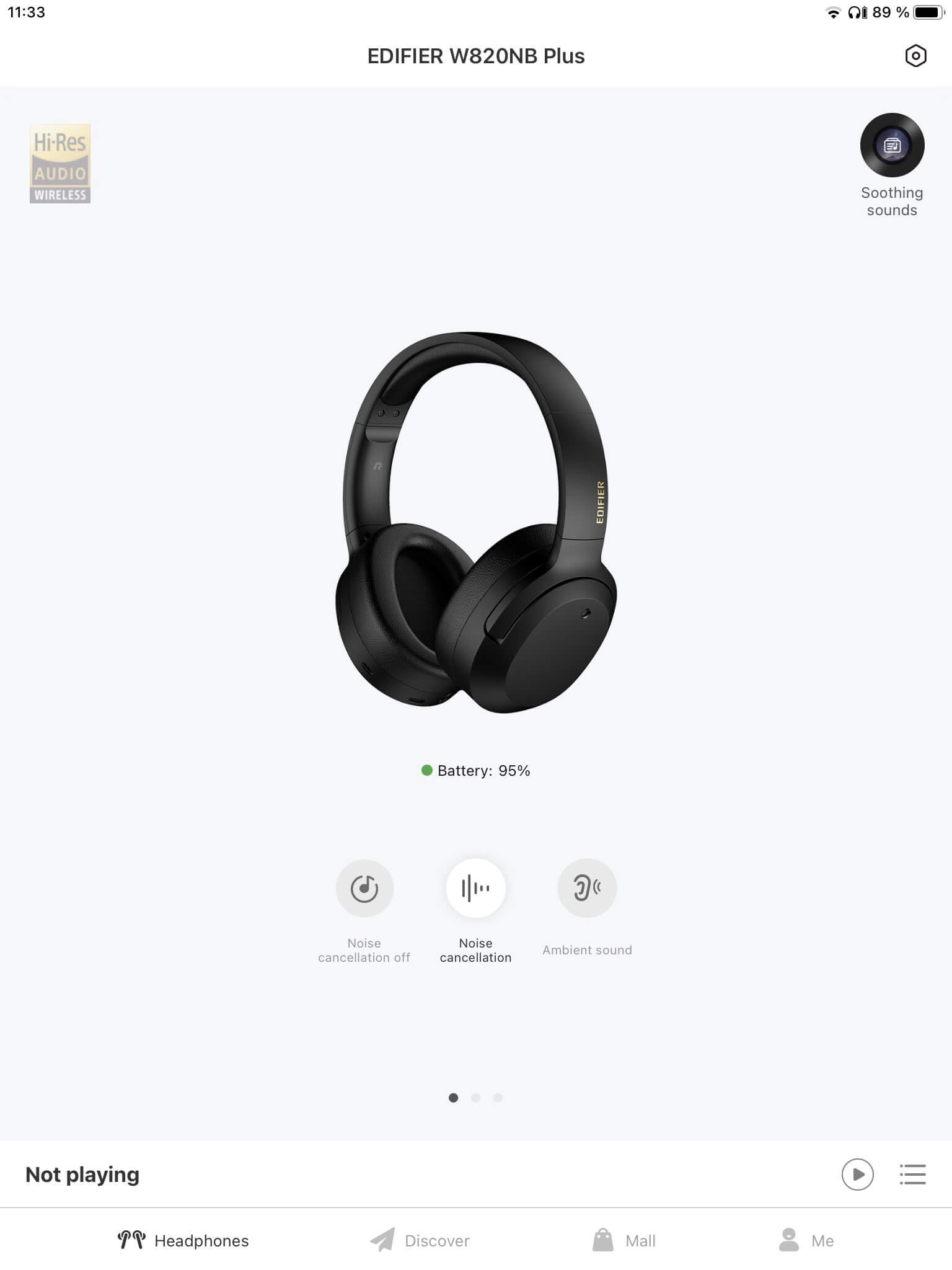 The Edifier W820NB Plus app (for Android and iOS) allows the ambient mode to be adjusted to the environment using seven intensity levels while the noise cancellation is fixed. In addition, it offers access to a wide selection of “soothing sounds” that can be used for relaxation or meditation. There are four pre-configured modes for sound control: “Classic”, “Pop”, “Classical” and “Rock”, with “Classic” being the default setting. However, unlike with the Edifier WH950NB, there is no EQ. On top of all this, the gaming mode can be activated and deactivated via the app, the volume can be adjusted, and a timer can be set. You can also carry out firmware updates.