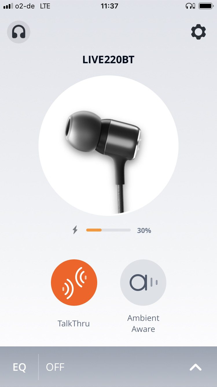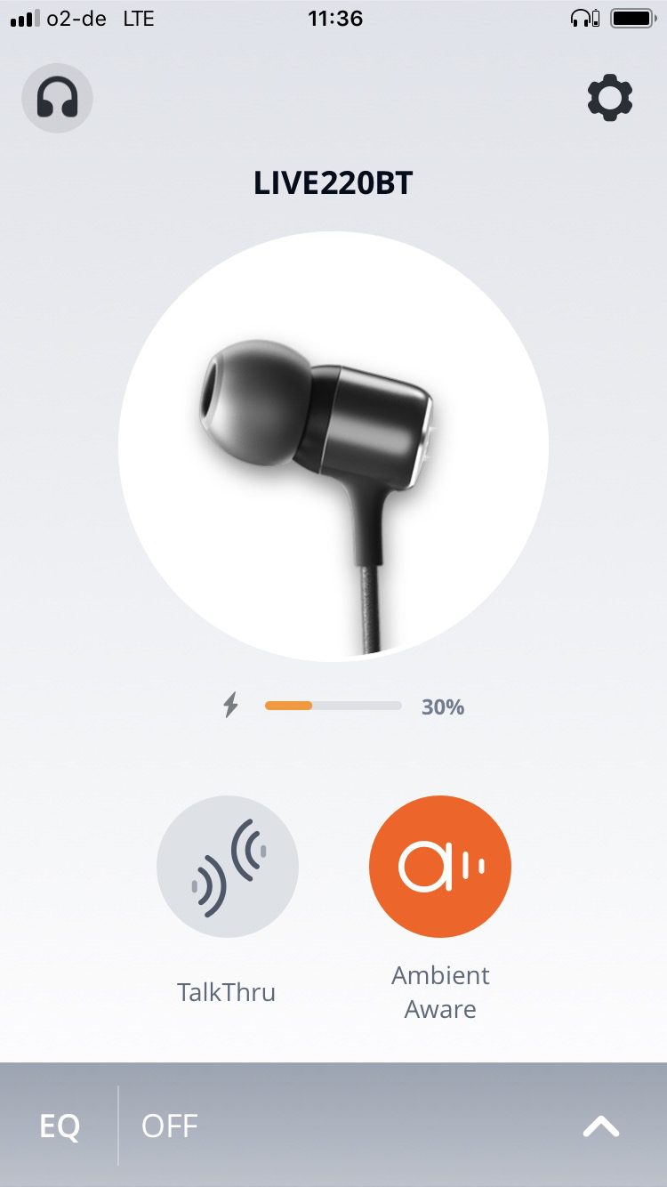 The dynamic 8mm drivers deliver a very appealing sound, even if the manufacturer keeps a low profile on the codec specifications. The Live 220BT is fun, sounds powerful and doesn’t disturb the person sitting next to you, despite the good level reserves on a smartphone. These headphones can handle pop, rock and urban genres with impressive performance. Even quiet compositions with a focus on the voice, jazz and even classical music can be heard well, although I wouldn’t classify the Live 220BT as completely neutral. In bass, the test device is full-bodied and powerful, but quite accentuated and dynamic. And even a low bass can be sensed.