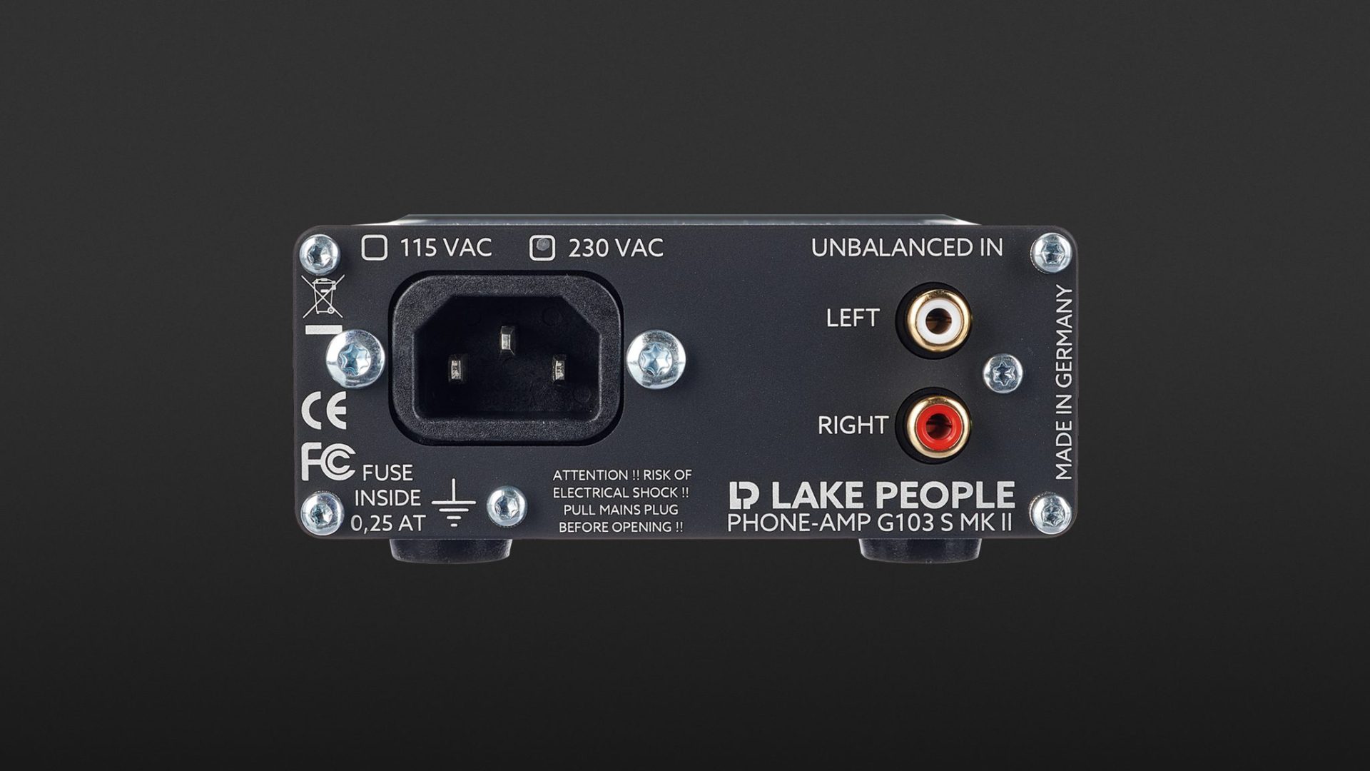 A power button for switching the G103-S MKII on and off is located on the front, with power being supplied via an integrated mains adapter. A green LED below the button indicates that the unit is ready for use. Two 6.3mm headphone jacks are located in the centre of the front panel, and these can be used in parallel but cannot be controlled separately. Therefore, it is suitable for models with comparable impedance if two headphones are to be connected at the same time. On the left, the volume can be adjusted via a rotary knob made of solid aluminium, and thanks to an Alps potentiometer, this allows for exact adjustment. On the rear, there is also an IEC/CEE socket for the mains cable with a Schuko plug and an RCA input on the standard version, which is indicated by the “S” in the name. Alternatively, Lake People also offer a headphone amplifier with balanced XLR inputs under the designation G103-P MKII (“P” for Professional).