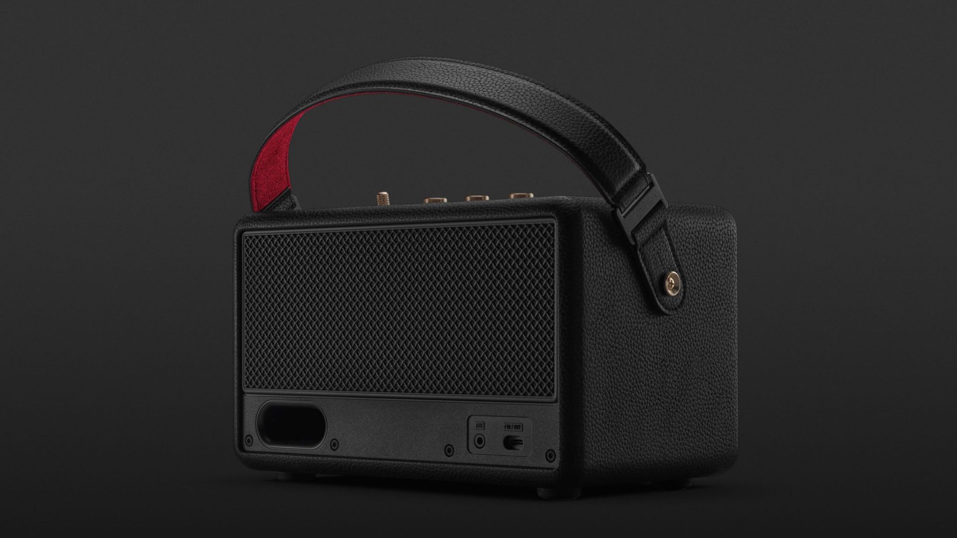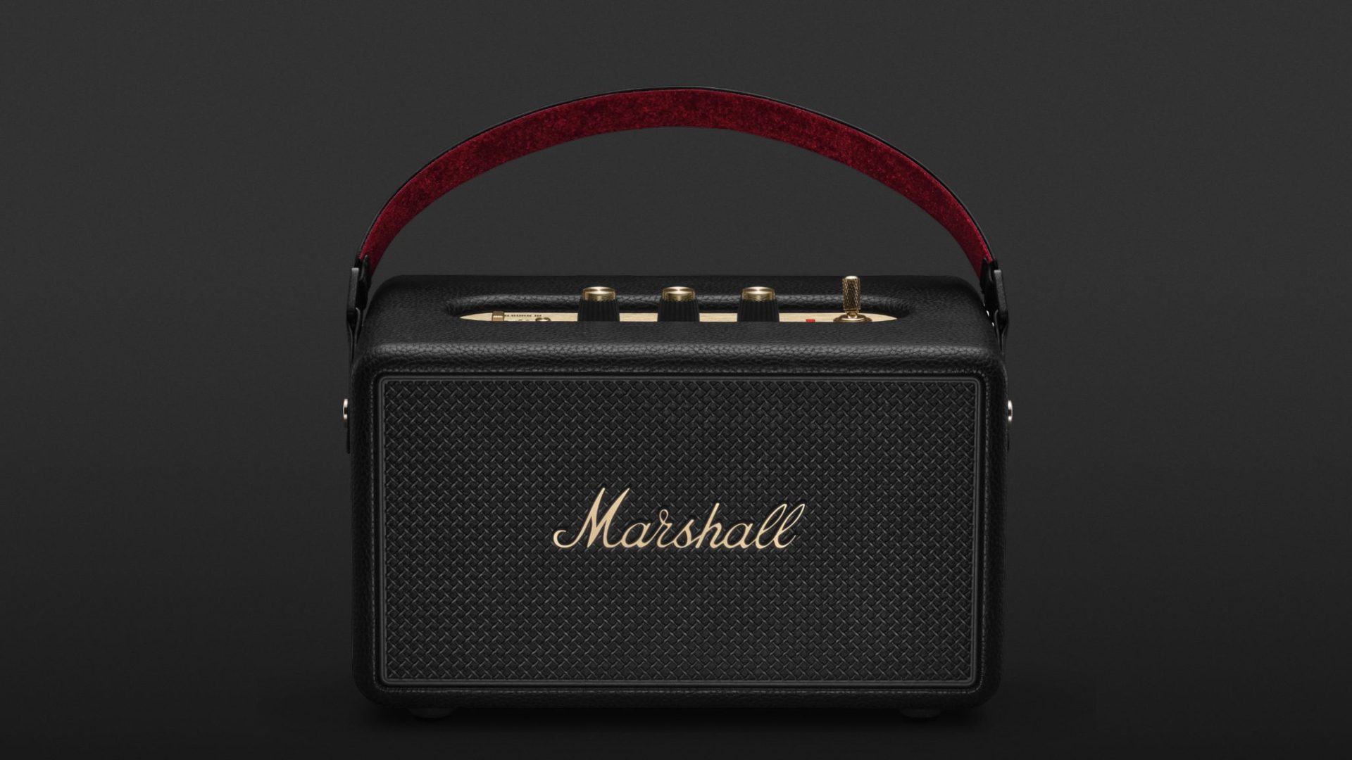 Weighing in at 2.8kg and measuring 27.3 × 15 × 16.9cm, the Marshall Kilburn III is solid and substantial. The detachable leather strap — lined with red velvet — is essential for carrying it to your next gathering. Wrapped in classic black Tolex with the gold Marshall logo on the grille, it rests on chunky rubber feet and offers IP54 protection against dust and splashes.