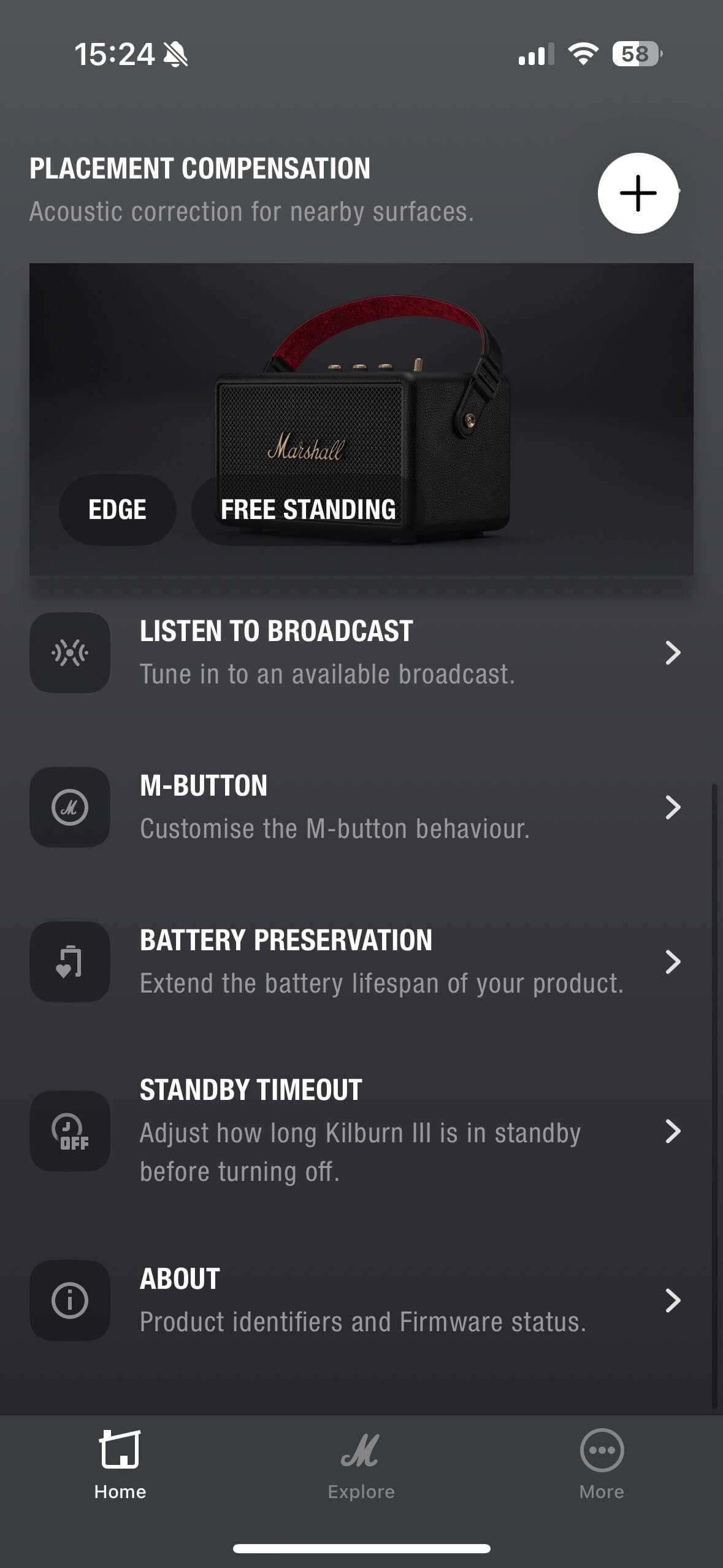 The Marshall Kilburn III uses Bluetooth 5.3 with Auracast, supporting SBC, LC3, and AAC codecs. Multipoint pairing is supported, though device management isn’t available via the app. The companion app allows you to: