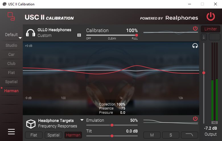 A calibration file specific to the X1 must first be downloaded from Ollo Audio’s website. When using the software, a virtual sound card is created, and the calibration file is loaded. From there, playback on the computer is tailored to the X1, with adjustment from 0% to 100% possible – also for the plugin version.
