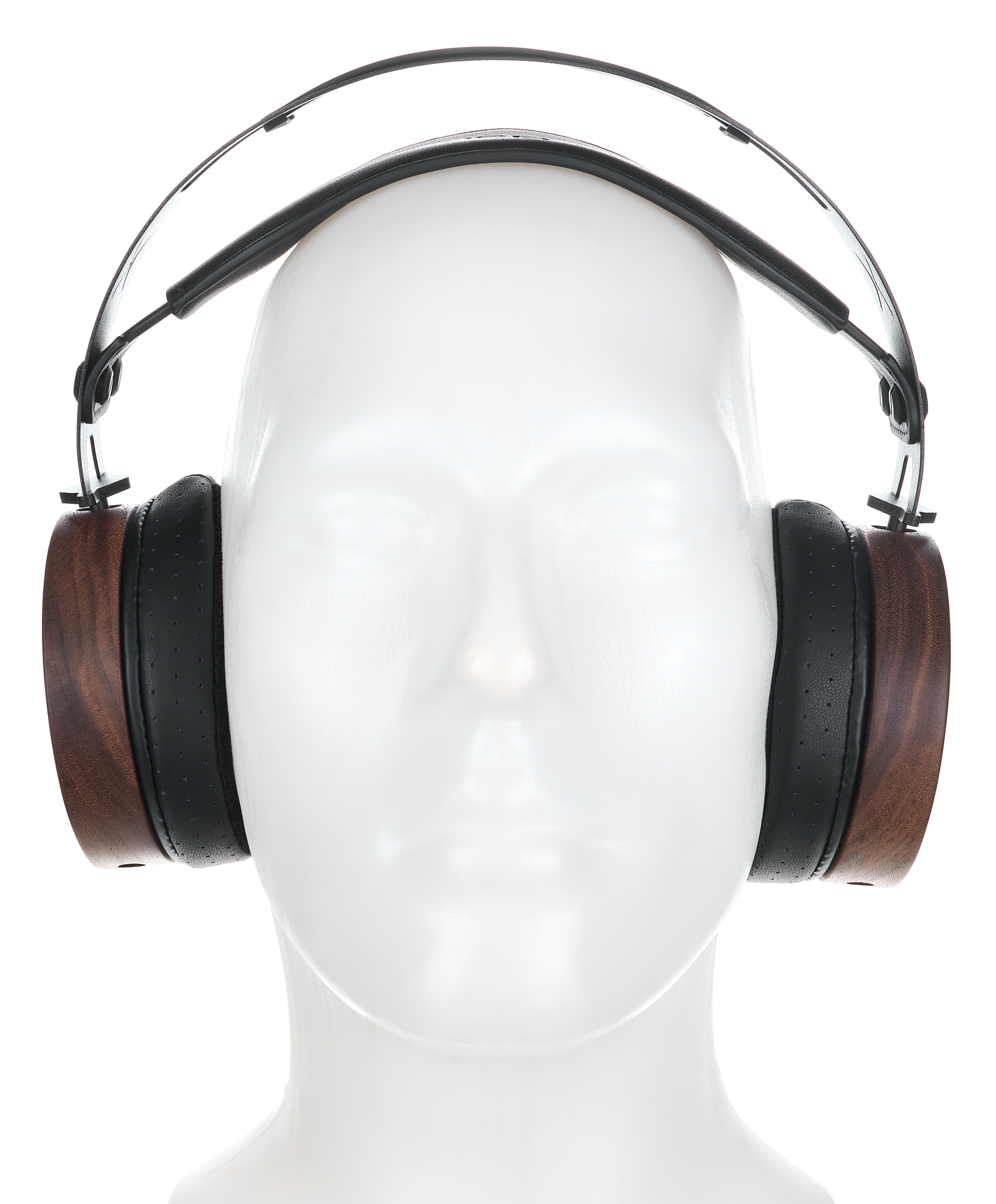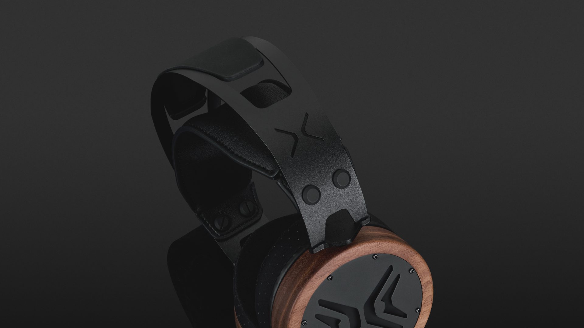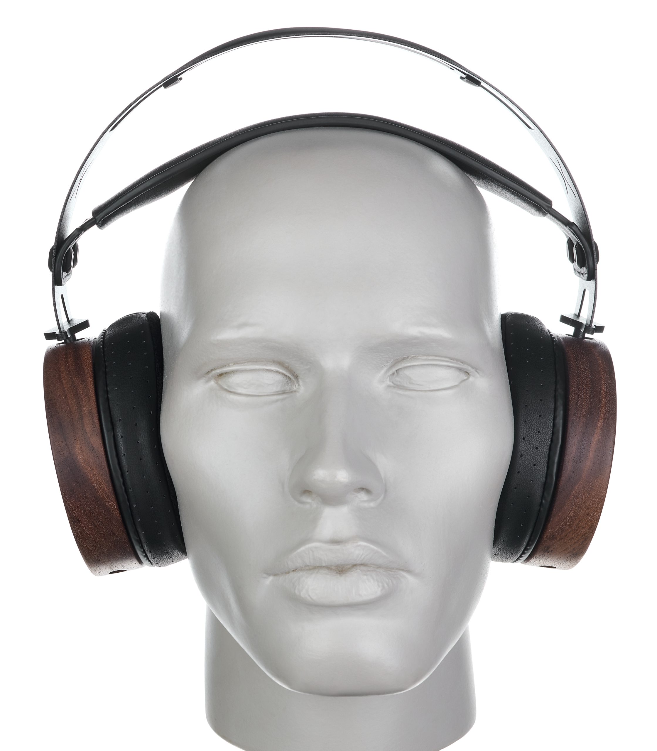The headband is made from stainless steel, making it robust and durable. A silicone insert appears to dampen the structure-borne sound of the metal frame. The ear cups are CNC-machined from a single piece of American walnut and can rotate freely 360 degrees. The rear is covered by black lacquered metal plates with large openings.
