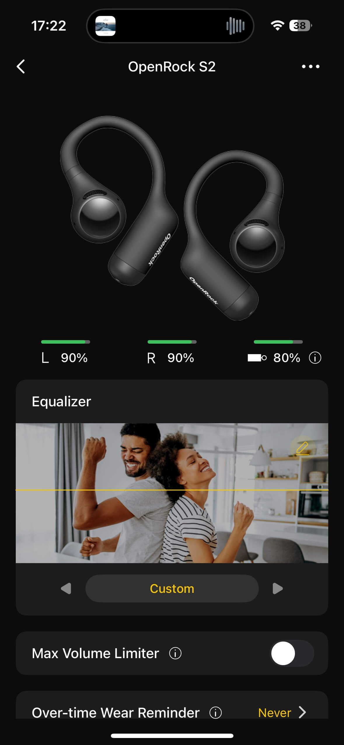The EQ offers three presets and a freely configurable 7-band option—just remember to save your changes, or they’ll be lost. There’s also a volume limit to protect your hearing, a sleep timer, and a wear-time reminder that prompts you to take a break after a set period. A “find my buds” feature plays a loud tone from missing but still paired earbuds. Spatial audio can be enabled, and firmware updates are available.