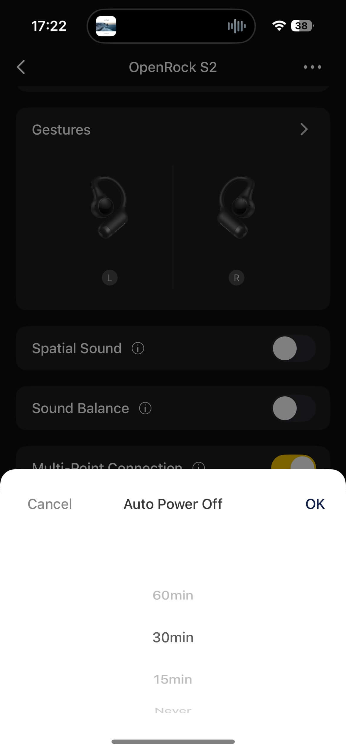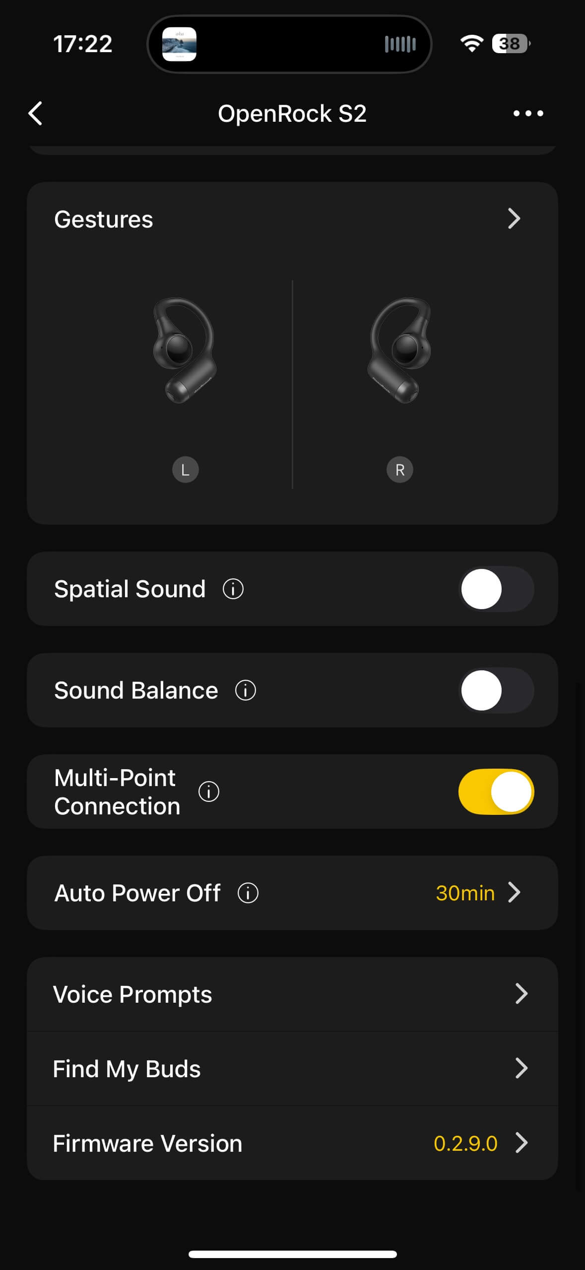 The OpenRock S2 use Bluetooth 6.0, support SBC, AAC, and LDAC codecs, and offer multipoint so two devices can be paired and used alternately. Each bud has a button for controls, but it’s not located on the driver housing as usual—it’s behind the ear at the bottom of the battery unit. Initially, I wasn’t convinced by this design, but holding the battery between your thumb and forefinger and pressing the button with your thumb actually works well, and all essential functions, including volume, are accessible.