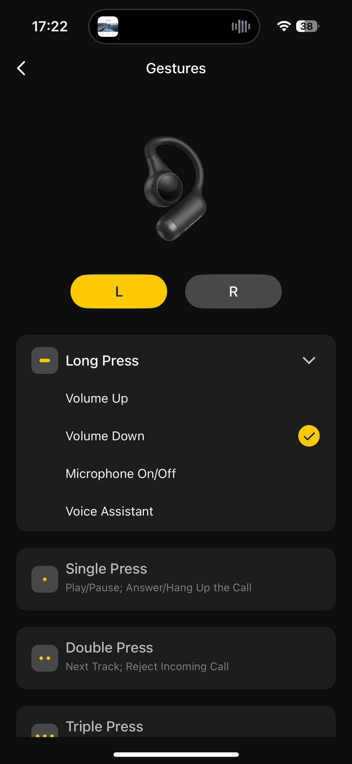 In the app, only the long-press action can be reassigned; single, double, and triple presses are fixed.