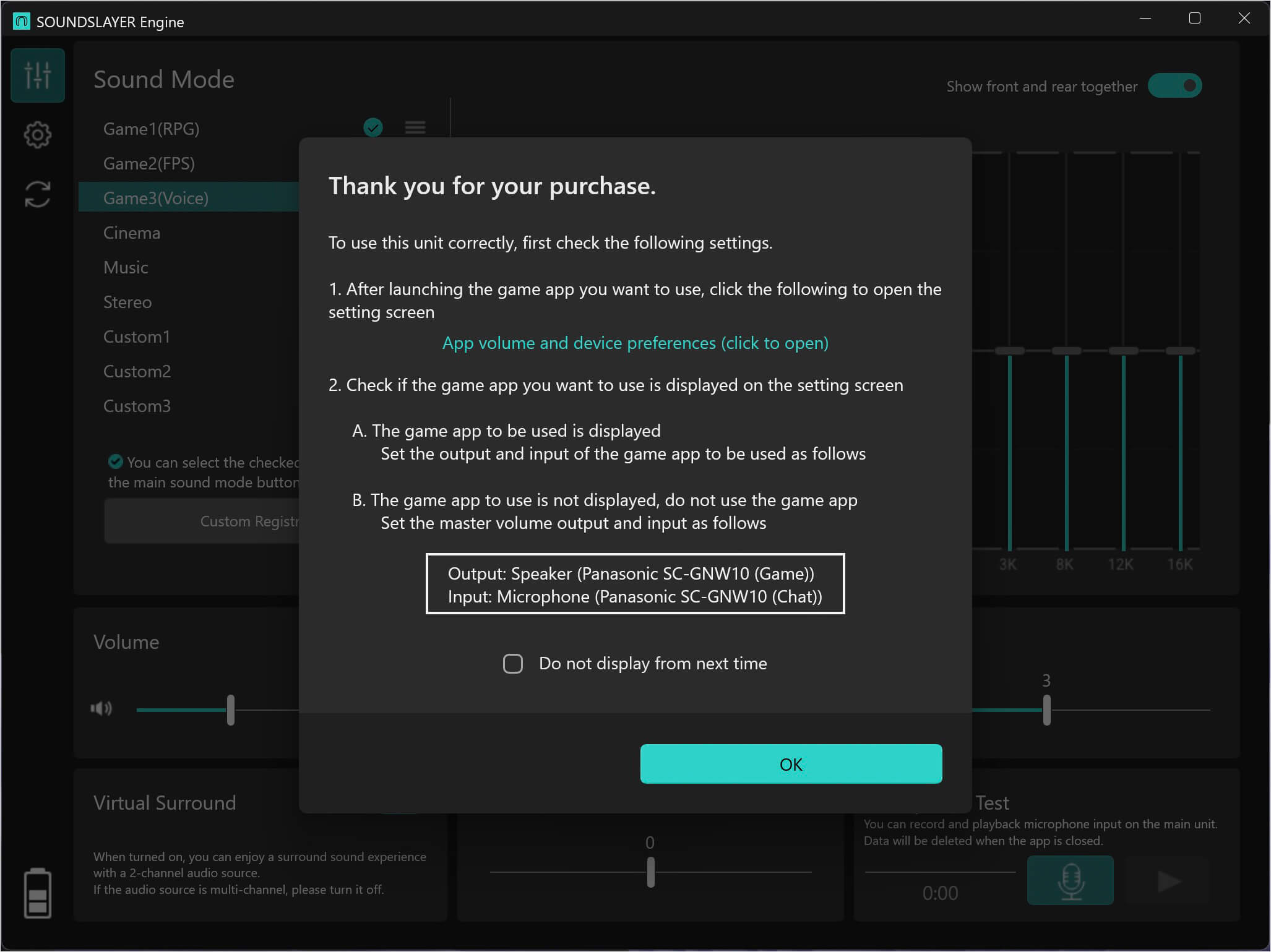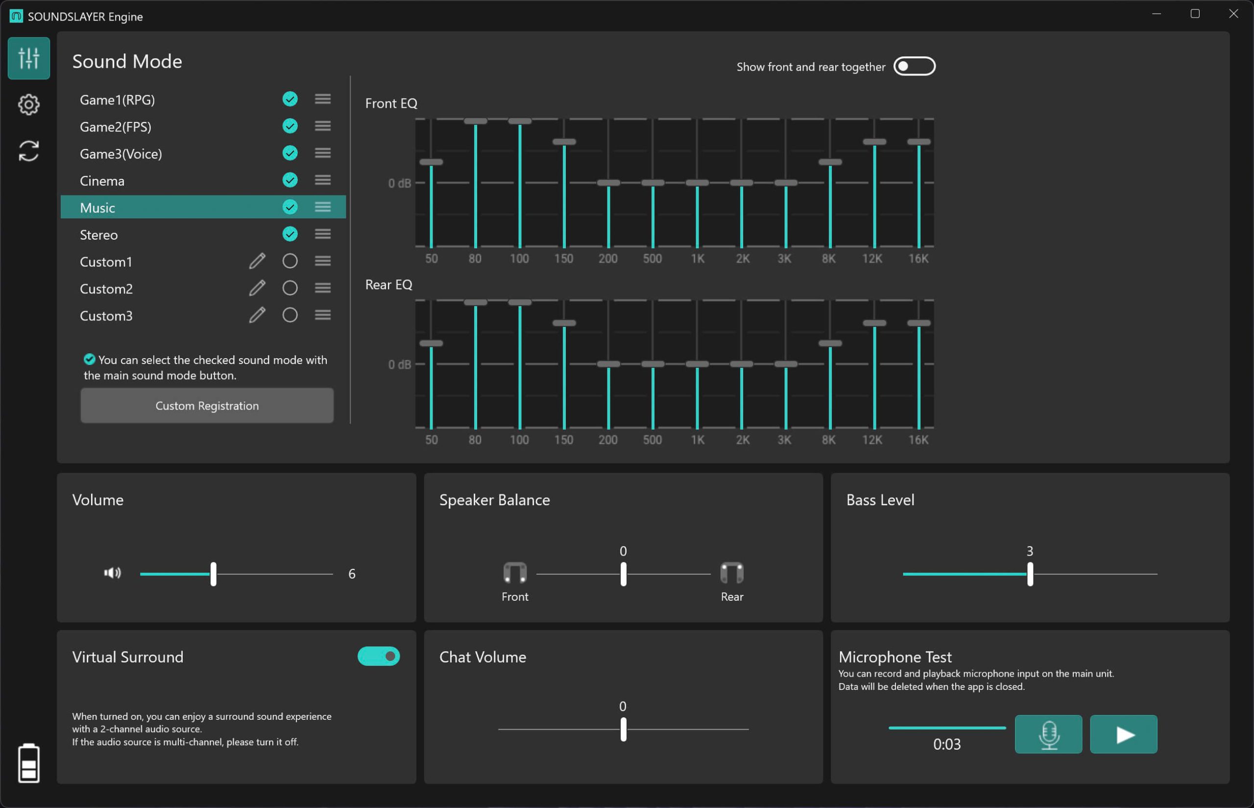 In addition to an EQ section for personalised sound settings, the app (for Windows) offers balance control for the four 38mm speakers, allowing you to set the ratio between the sound from the front (left/right) and rear (left/right). It is also possible to control the intensity of the bass reproduction as well as the overall and chat volumes via the app, and the microphone technology can be tested using a short voice recording. In addition, it displays the status of the battery, and you can activate or deactivate functions such as the illumination of the SoundSlayer SC-GNW10E, automatic switch-off after five minutes of inactivity or surround sound. Firmware updates can also be carried out via connection with the app.