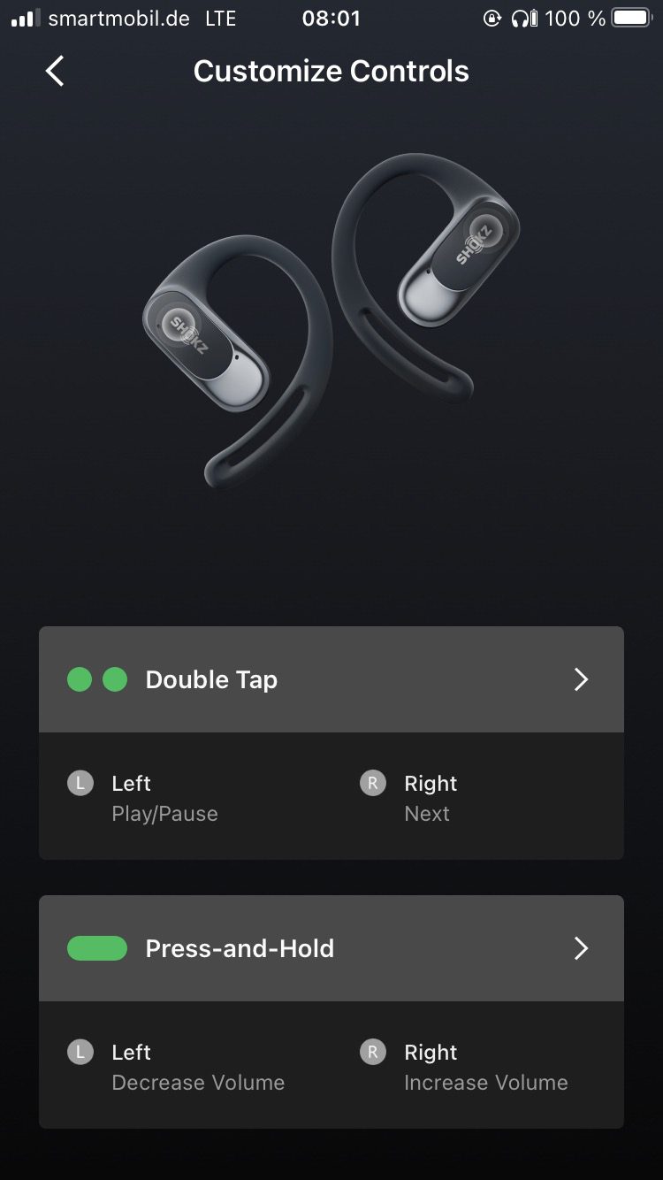 The touch-sensitive side areas could be triggered reliably, but sometimes they were too quick to react during phone calls. The functions can be configured via the straightforward, free iOS/Android app but are limited to double-clicks and hold gestures. Nevertheless, this offers a good way to start and pause music, make phone calls, skip tracks or control the volume.