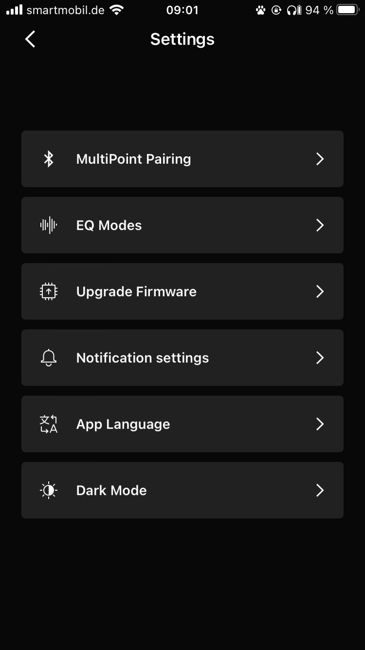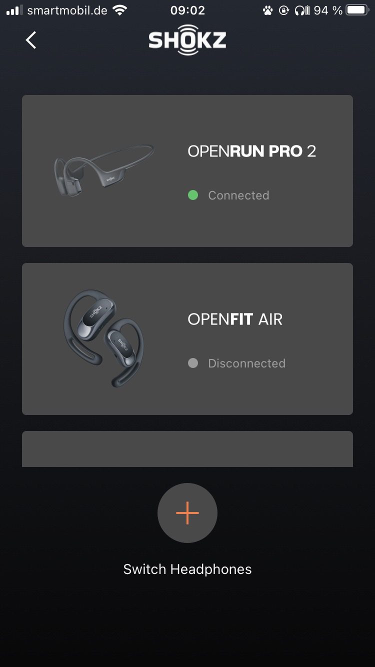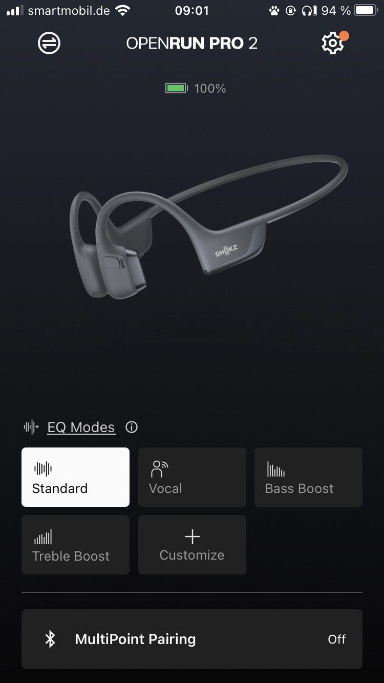 As for operation: Pairing is quick and the Bluetooth connection remains stable and can be used across several rooms. On the underside of the right bracket, there are plus and minus switches to adjust the volume. The device can also be switched on and off from here. On the outside of the left bracket is a mechanical multi-function button. This is used to control music playback, skip tracks, handle phone calls and call up a voice assistant on your smartphone. This is done with one to three clicks and a long press. In practice, this works well with a little practice and is partly supported by beeps and voice prompts in several languages. The Shokz app for Android and iOS is free and allows you to update the unit, pair it with two transmitters (multipoint) and adjust the sound to your taste using the equaliser. The equaliser allows you to choose between four predefined modes and two user-defined modes.