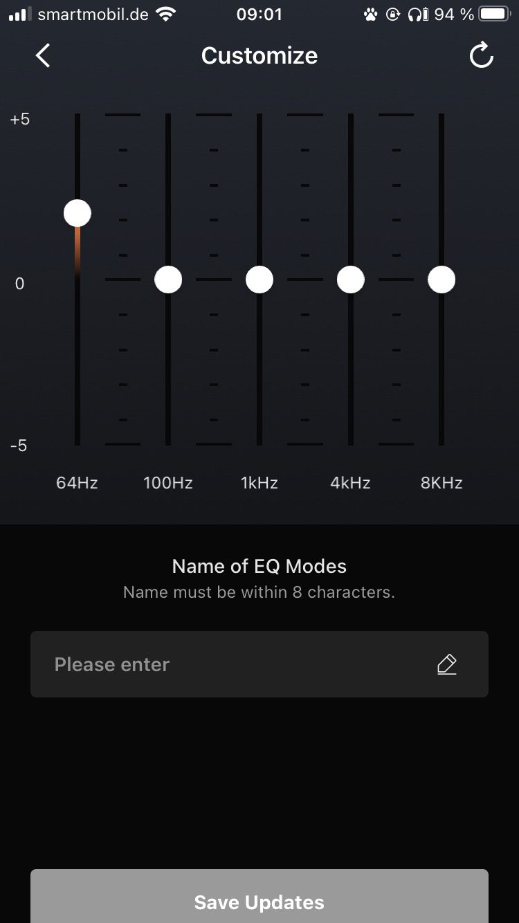 Pairing is quick and the Bluetooth connection remains stable and usable across several rooms. On the underside of the right bracket, there are plus and minus switches for adjusting the volume. You can also turn the unit on and off from here. On the outside of the left bracket is a mechanical multi-function button. You can use it to play music, skip tracks, make and receive phone calls, and call a voice assistant on a smartphone. This requires between one and three clicks and a long press. This works well with a little practice, and is partly supported by beeps and announcements in several languages. The Shokz app for Android and iOS allows you to update the unit, pair it with two transmitters (multipoint) and adjust the sound to your taste using the equaliser. The equaliser allows you to choose between four predefined modes and two user-defined modes.
