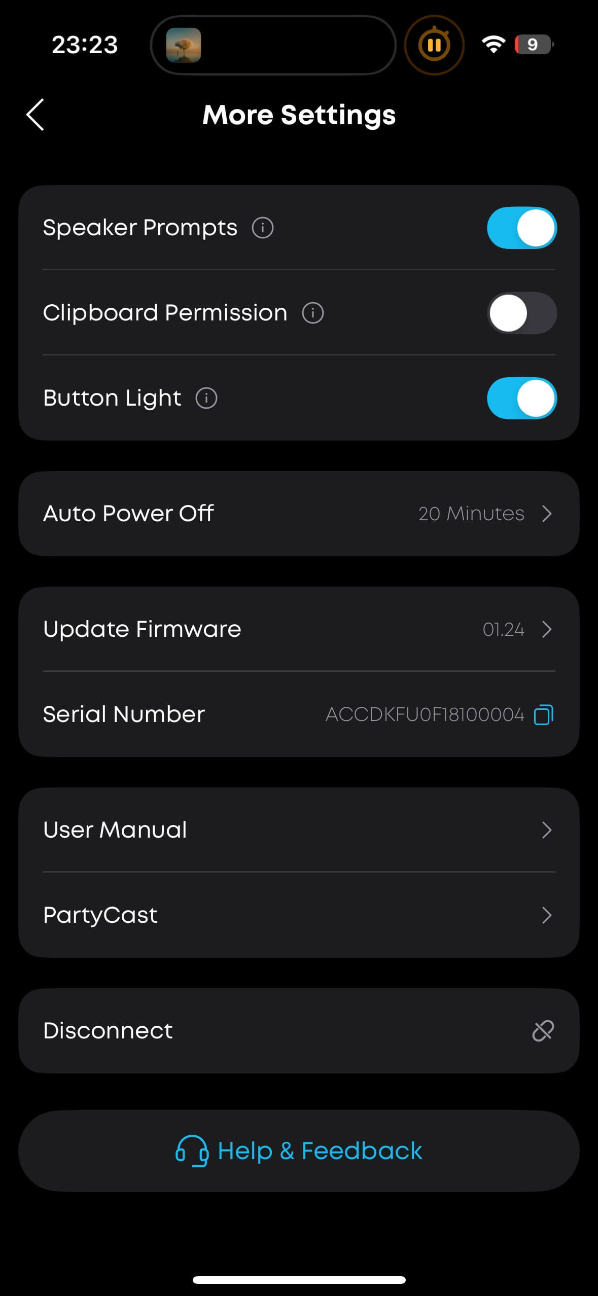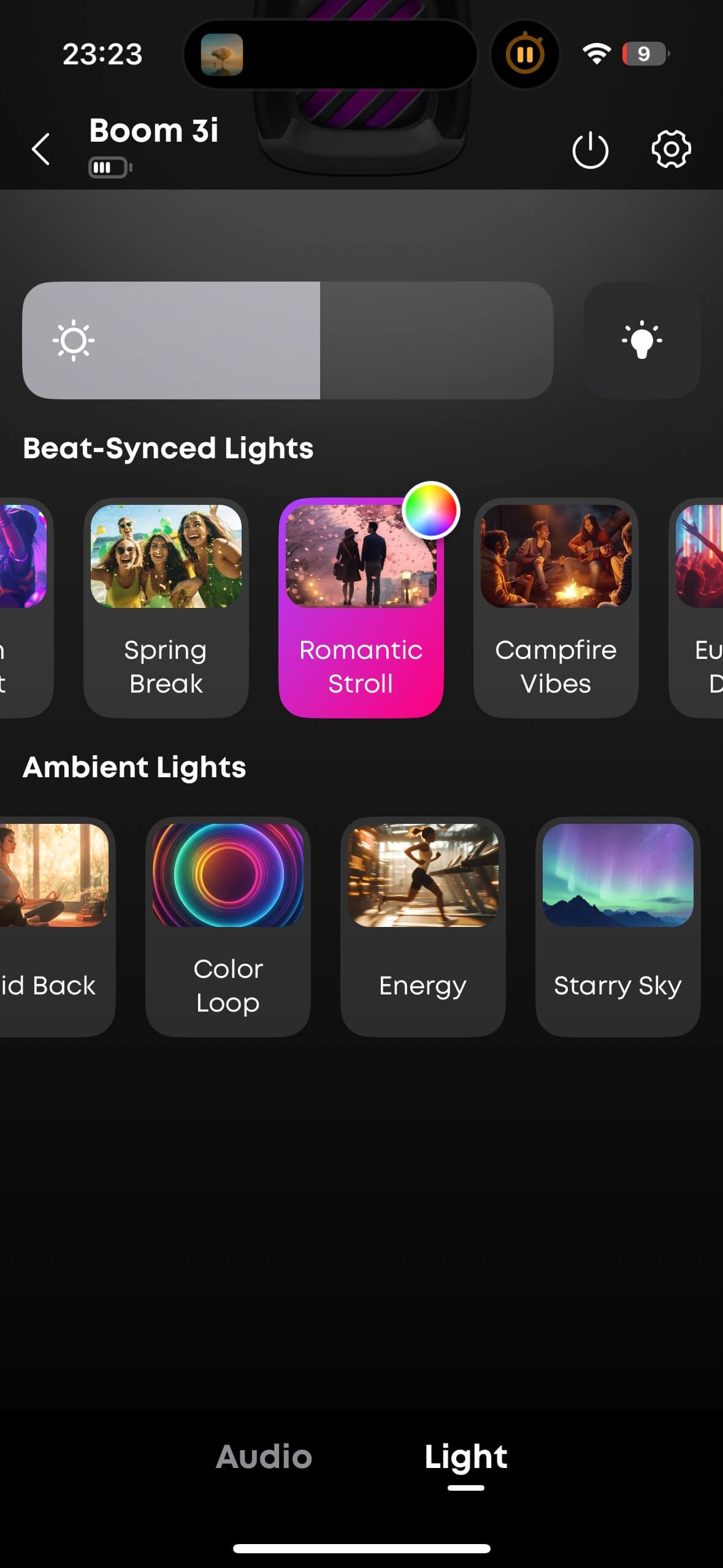 All essential functions, including Partycast, can be controlled directly on the speaker. In the app, you’ll find an equalizer with four presets and a 9-band EQ for custom sound setups. You can install updates and set a sleep timer. In the “Light” section, you can choose from a large number of pre-programmed light effects with names like “Passionate as Fire” or “Crazy Midnight”, customise colours, and decide whether the effects follow the beat or play randomly.