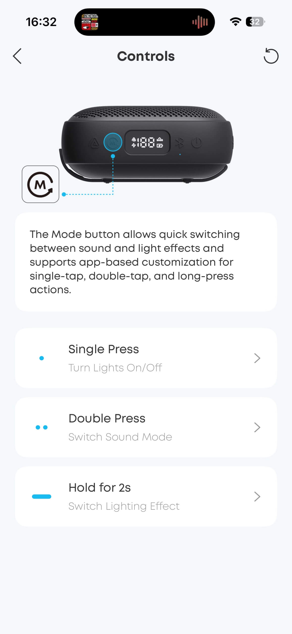 The app includes an EQ section with four presets and a 9-band EQ for custom sound profiles. The BassUp 2.0 function can be activated either in the app or directly on the speaker to squeeze more low-end punch out of the compact cabinet. In ECO mode, non-essentials like EQ, BassUp, and the lights are all switched off to extend battery life. The mode button on the housing can be customized in the app with various functions. There’s also the option to pull relaxing nature sounds or ambient audio from a built-in library, or to build your own personal soundscape using an extensive sound matrix.