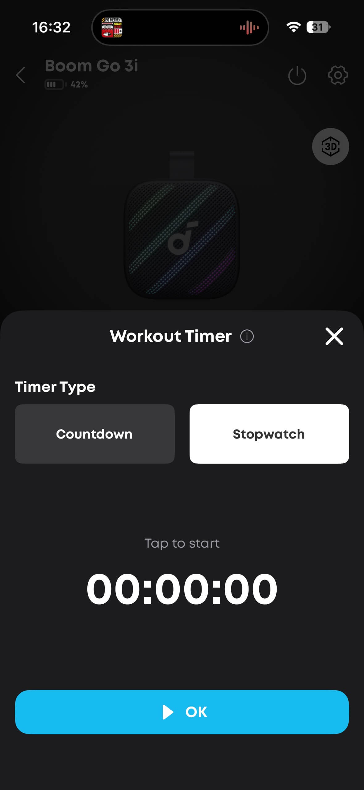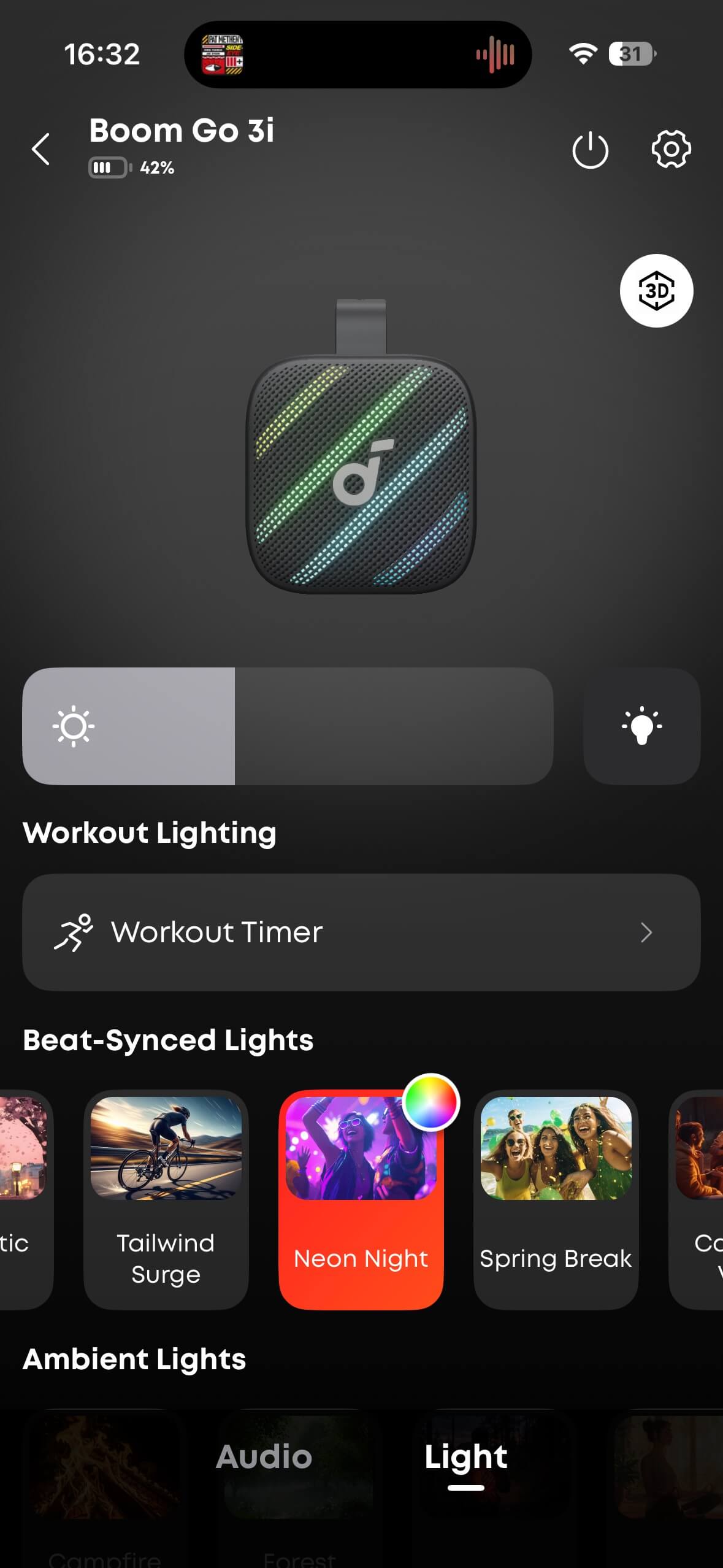 Under the lighting section, the app offers various presets for beat-synchronized flashing or ambient glow. In both modes, the speaker lights up and pulses even without music playing — something I find a little distracting, but thankfully the mini light strips can be turned off entirely. There’s also a workout timer that keeps the lights running as a visual cue to stay active.