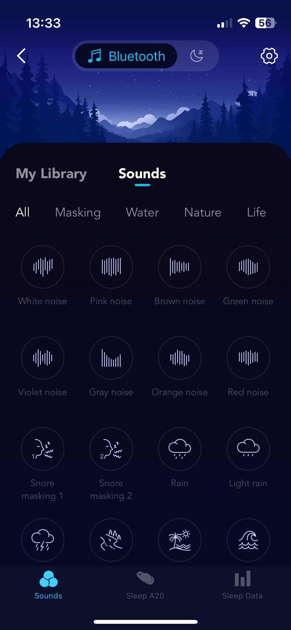 The A20s offer two listening modes. In Bluetooth audio mode, they play any media content, such as music, podcasts or films. If you activate sleep mode, the headphones track your sleep behaviour in conjunction with the app, and you have access to the above-mentioned sounds, which are grouped according to “Masking”, “Water”, “Nature”, “Life” and “Meditation”. By double-tapping one of the earbuds, you can switch between the listening modes and configure them to play all night or until you fall asleep. This can be done manually (by timer) or automatically. The masking sounds are stored locally in the headphones so that the Bluetooth function can be deactivated to extend battery life.
