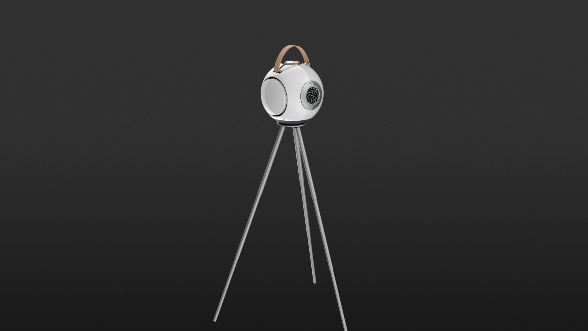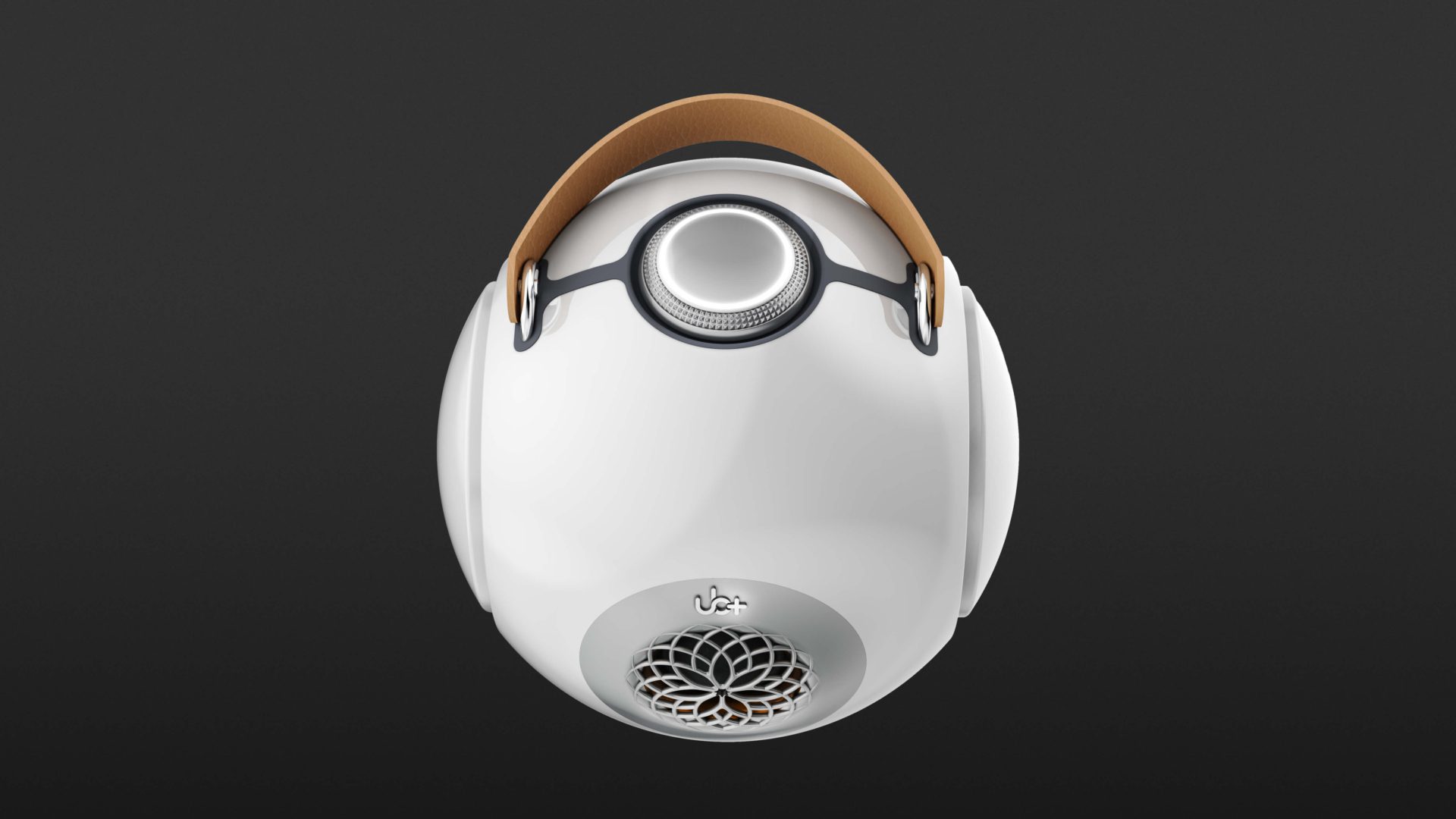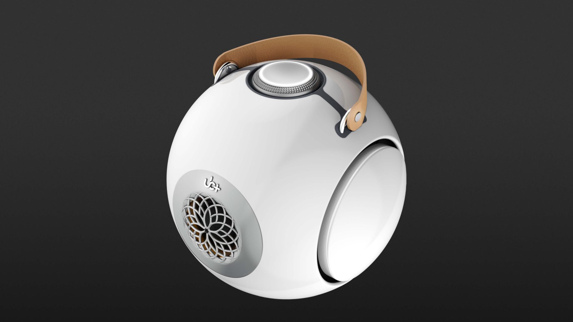 Along with the dB1 Doublebass, UB+ includes a USB-C cable, a leather carrying strap, and a small, height-adjustable metal tripod stand. Thanks to a strong magnet, the dB1 can be placed securely on the stand. The spherical enclosure is made from very sturdy polycarbonate and features a high-gloss, smooth surface. The front is defined by the opening for the 1.5-inch tweeter, protected behind a floral-style grille, delivering 20 watts of power.
