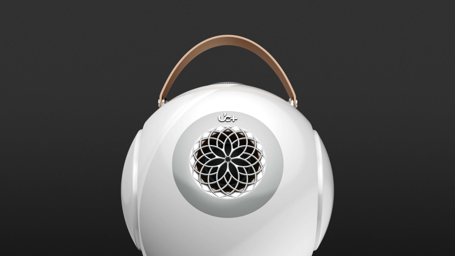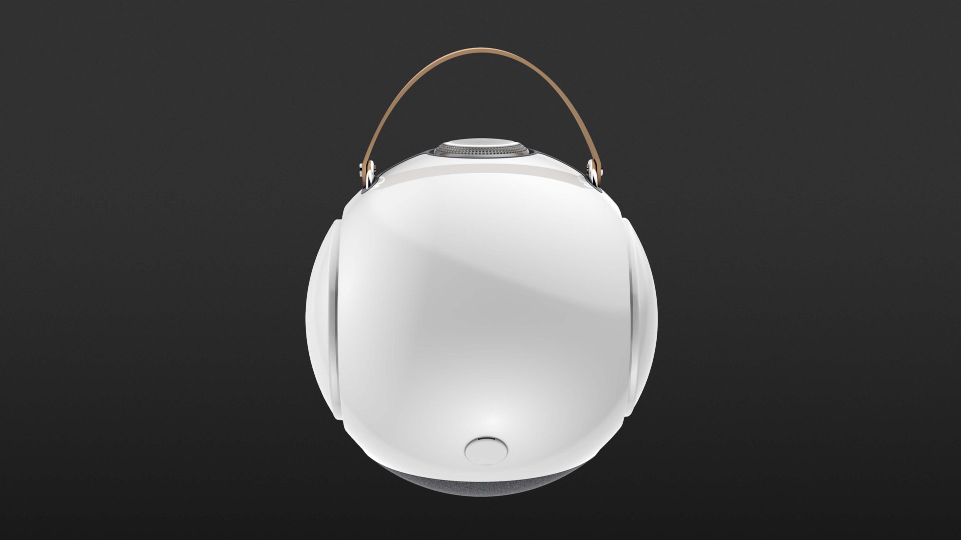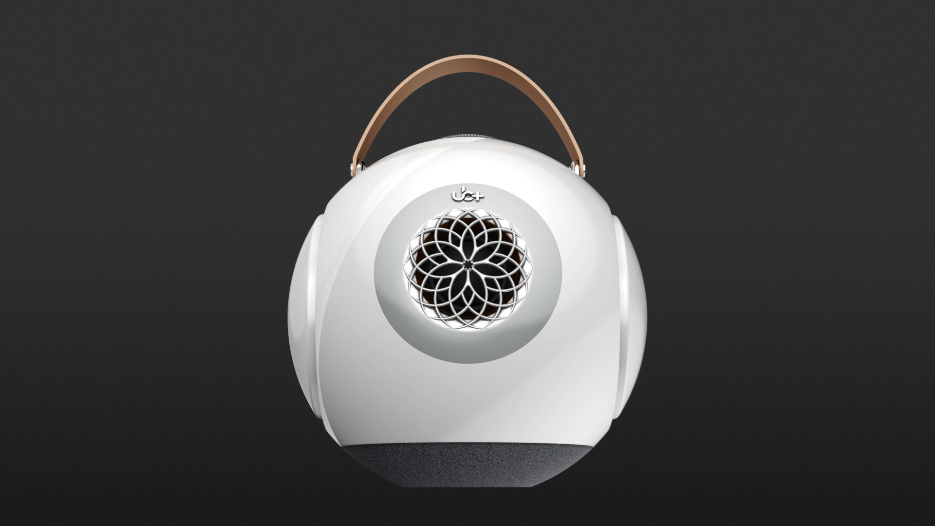 Along with the dB1 Doublebass, UB+ includes a USB-C cable, a leather carrying strap, and a small, height-adjustable metal tripod stand. Thanks to a strong magnet, the dB1 can be placed securely on the stand. The spherical enclosure is made from very sturdy polycarbonate and features a high-gloss, smooth surface. The front is defined by the opening for the 1.5-inch tweeter, protected behind a floral-style grille, delivering 20 watts of power.